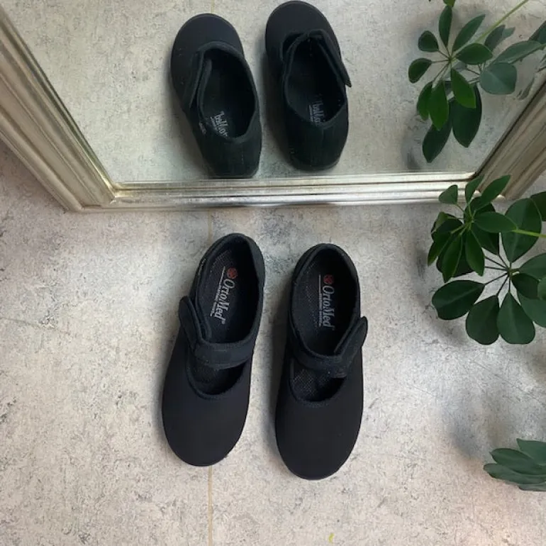 Modellen på videoen bærer et nummer større end sin almindelige størrelse. Ønsker du at have ekstra meget plads bag hælen og foran tæerne (eventuelt til en tyk strømpe), vælg da et nummer større end normalt.