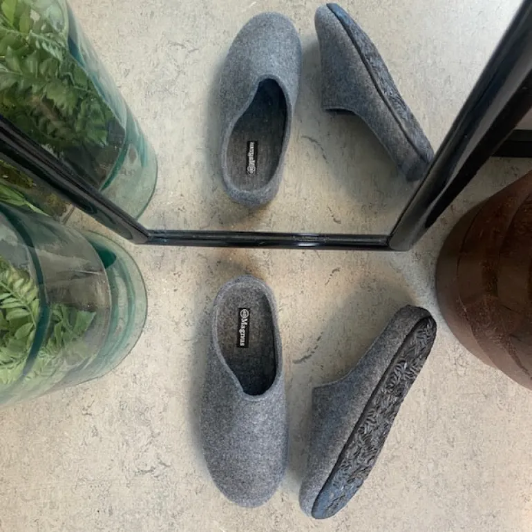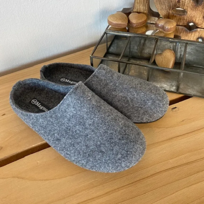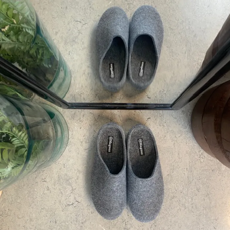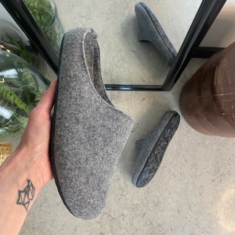 Lysegrå filthjemmesko, som giver dig komfort og varme.