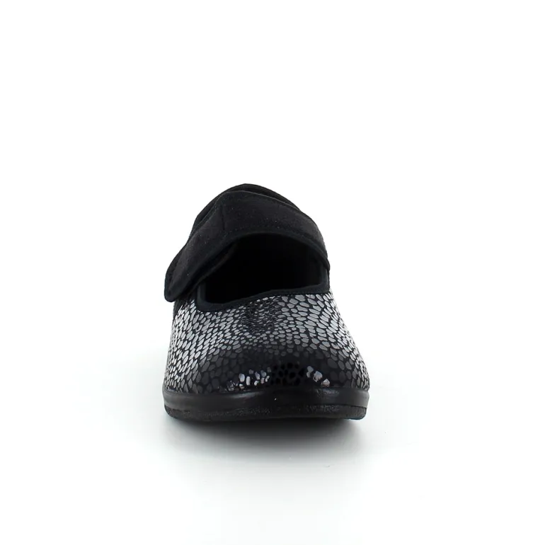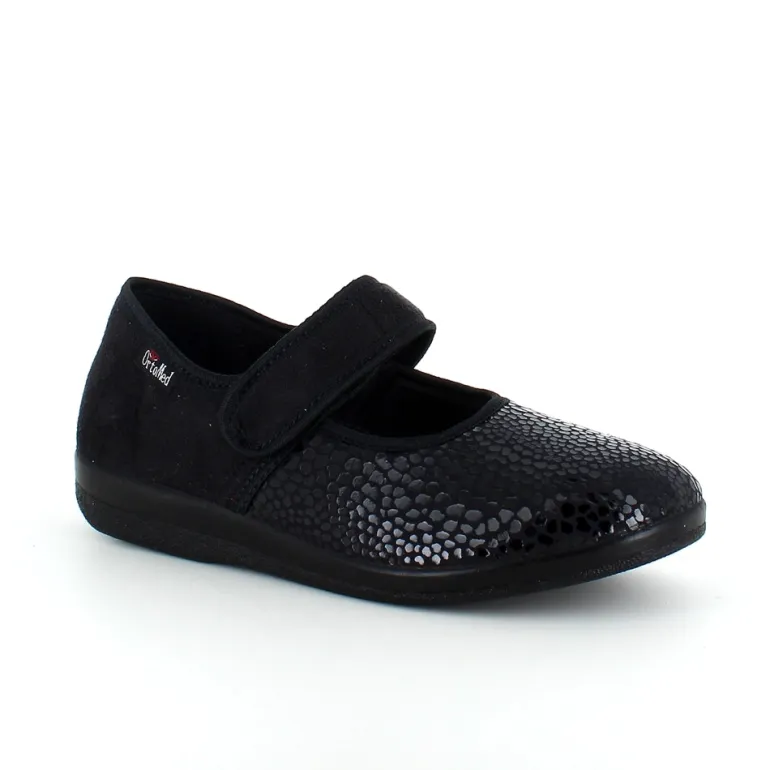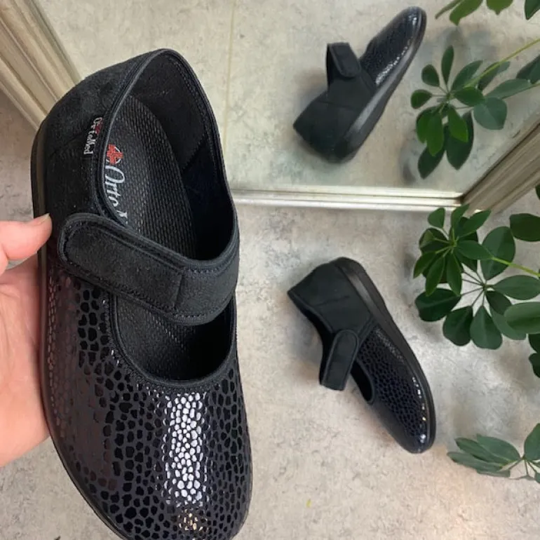 Bred ortopædisk sko i sort med velcro omkring ankel. Forfoden har glat elastisk stof som giver forfoden ekstra plads.