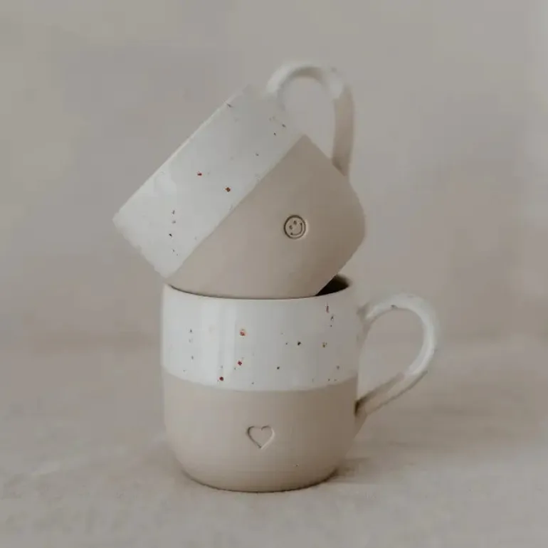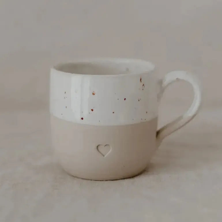Denne smukke keramik kop kombinerer enkelthed og charme i et tidløst design. Den er todelt i et naturligt beige look forneden og en glaseret hvid top med små rustikke prikker, som giver et unikt og håndlavet udtryk. Som ekstra detalje er der et lille indgraveret hjerte på forsiden – en fin og kærlig detalje, der gør koppen helt særlig.
