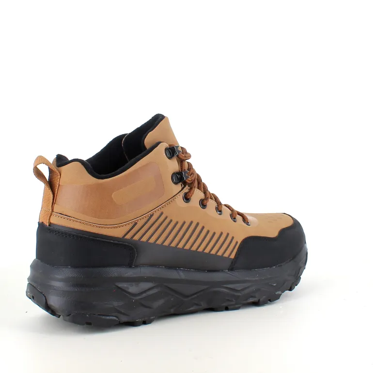 Stilfuld og praktisk herre ankelstøvle i lysebrun PU med moderne detaljer og kontrastfarvet sål.