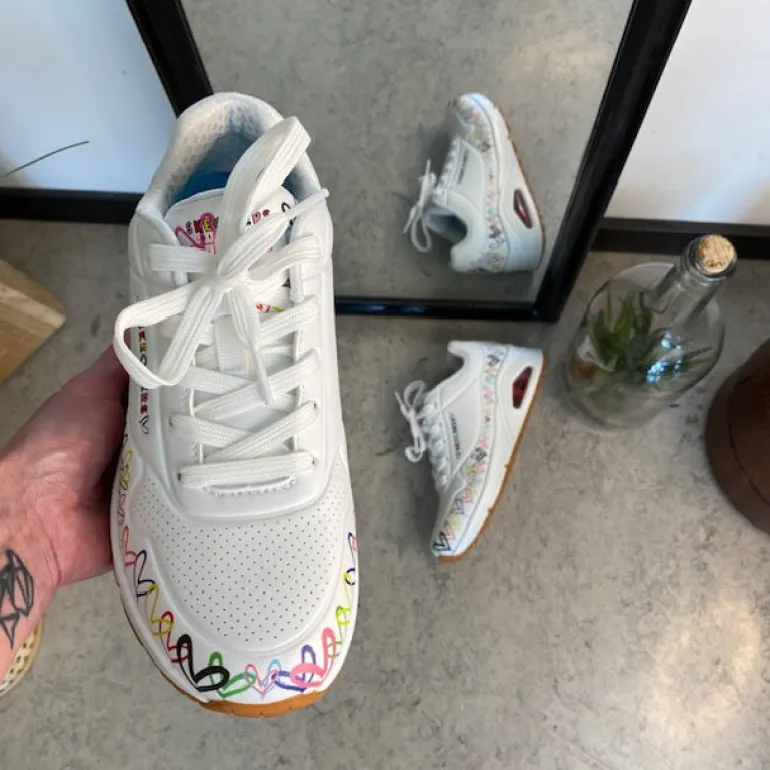Oplev disse unikke sko skabt i samarbejde mellem kunstneren James Goldcrown, kendt for sine Lovewall-hjerter, og Skechers.