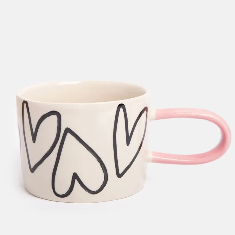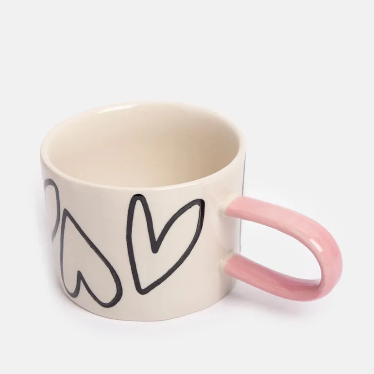 Dette stilfulde krus bringer både charme og glæde ind i kaffepausen. Den cremefarvede overflade er dekoreret med store, håndtegnede sorte hjerter, der skaber et legende og kærligt udtryk. Den lyserøde hank tilfører en blød kontrast, som gør kruset ekstra feminint og indbydende.