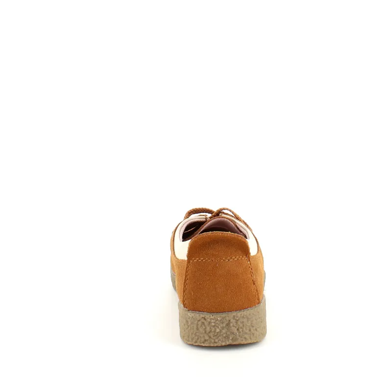 Lys brun ruskindsko med gummisål har en elegant design med en beige læderkant ved åbningen. Skoen har snørelukning og en tydelig syning i overdelen, som giver et stilfuldt udseende. Den indvendige skum sål er beklædt med læder for komfort, og modellen er almindelig med en bredde på 7.5 cm i størrelse 37. Ydersålen er lavet af rågummi, hvilket giver god stødabsorbering og fleksibilitet. Skoen fås i størrelserne 36-41 og i mange forskellige farver.