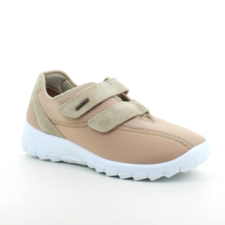 Sko i lys beige med skind detaljer og en meget bred pasform.