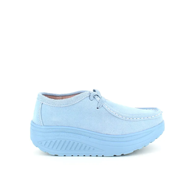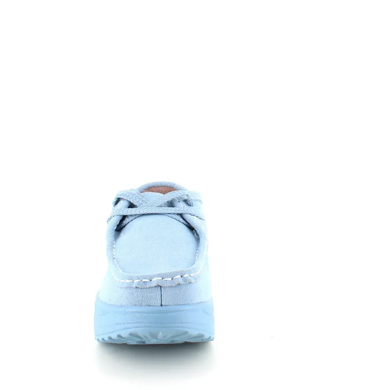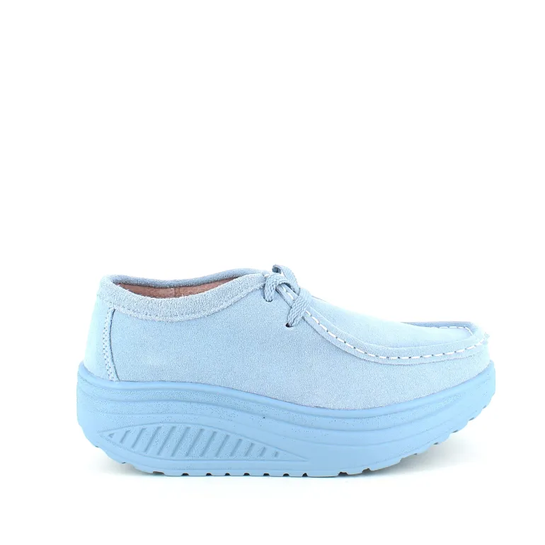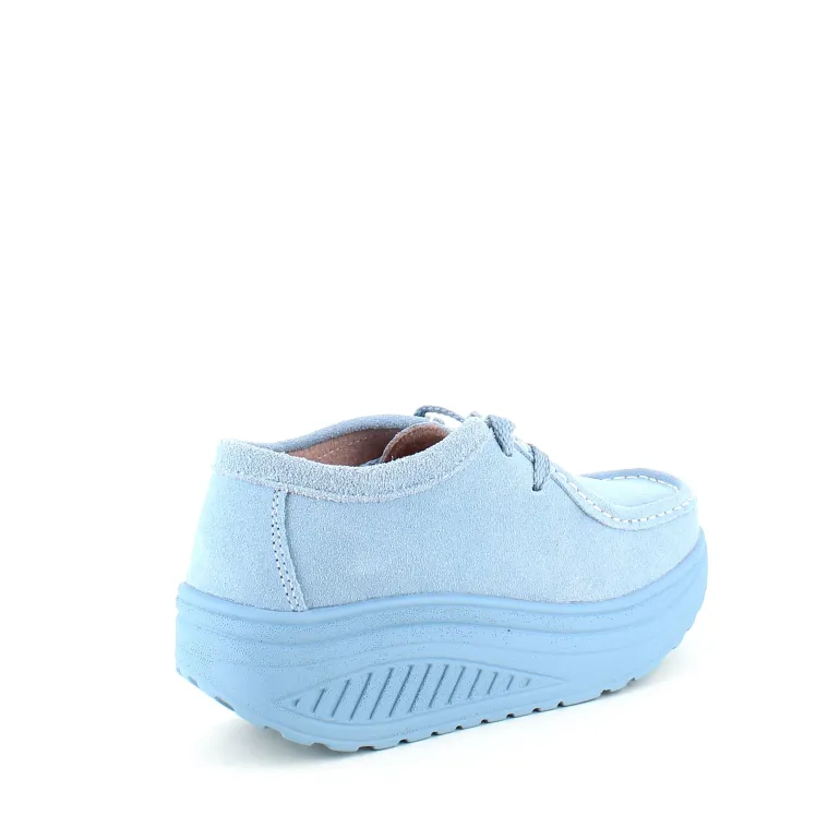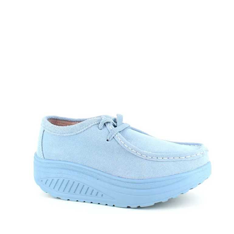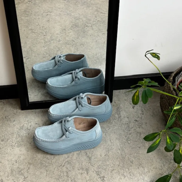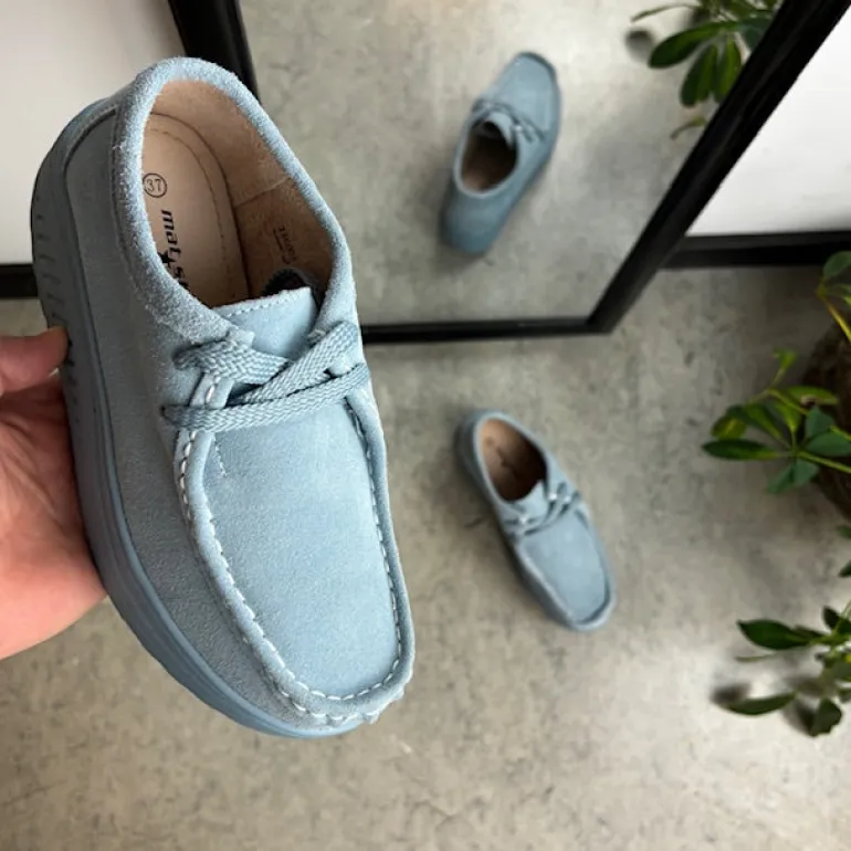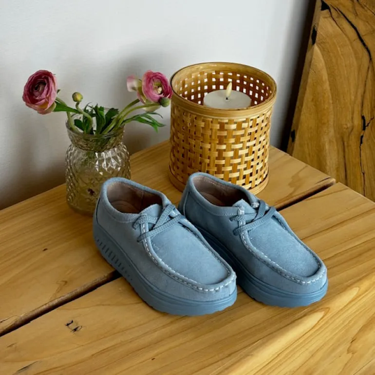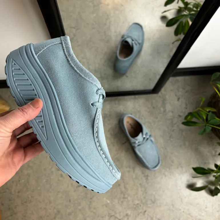 Lyseblå ruskindsko med gængesål og svangstøtte tilbyder både stil og komfort.