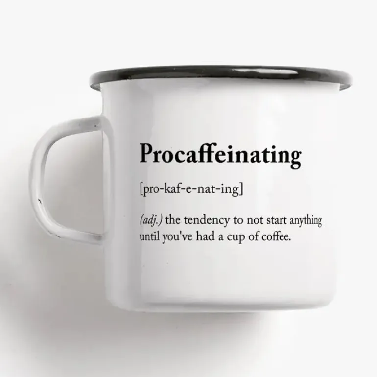 Denne hvide emaljekop er dekoreret med det humoristiske ordspil Procaffeinating, defineret som tendensen til ikke at starte noget, før man har fået sin kaffe. Et oplagt valg til dig, der ikke kan komme i gang med dagen uden den første kop – og som gerne vil tilføje et smil til morgenstunden.