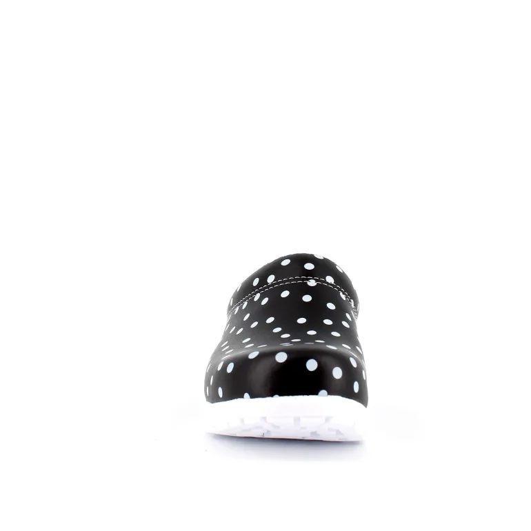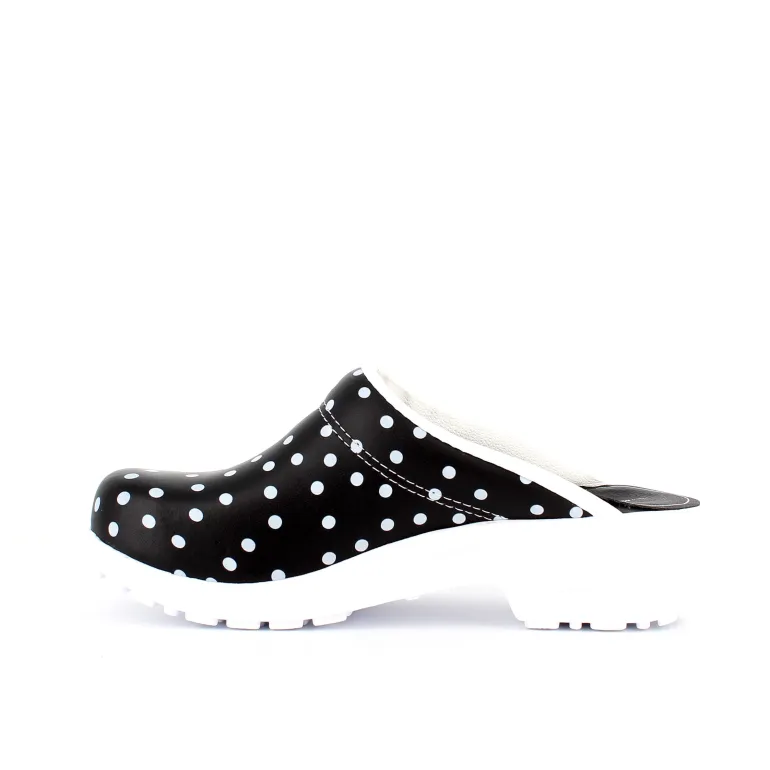 Sorte polkaprikkede træsko i dansk kvalitet.