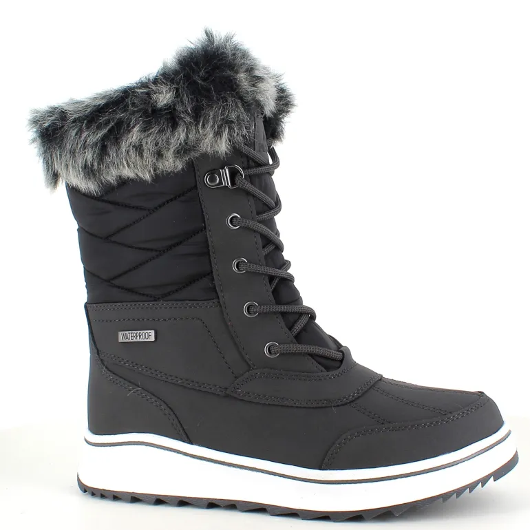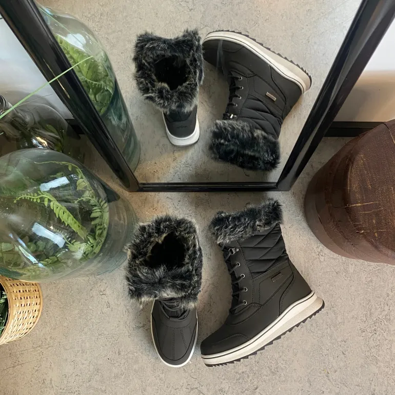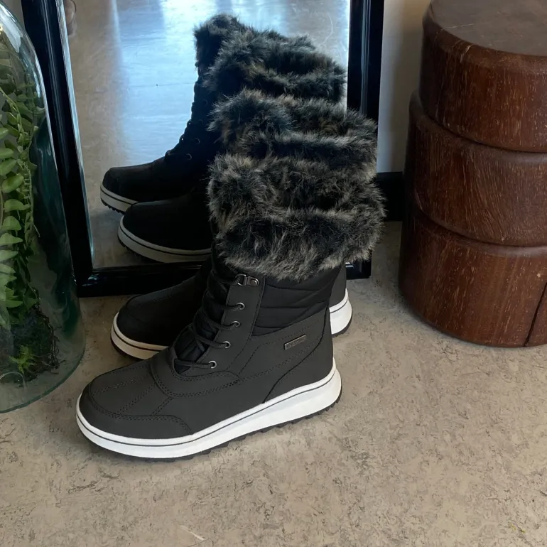 Sort vinterstøvle fra Mols, designet med vandtætning og pelskant, tilbyder både stil og komfort.