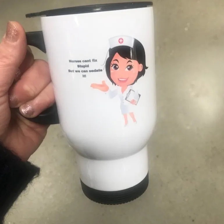 Thermo krus i hvid med lille sjovt citat og en sød sygeplejerske på.