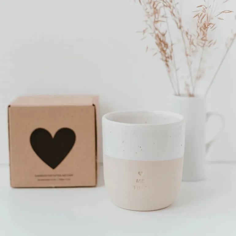Dette smukke keramik krus er designet i et enkelt, nordisk udtryk med en naturlig beige bund og en glaseret hvid top med små rustikke prikker. På forsiden er der præget et lille hjerte samt teksten Me Time, der minder dig om vigtigheden af at tage en pause og nyde øjeblikket.