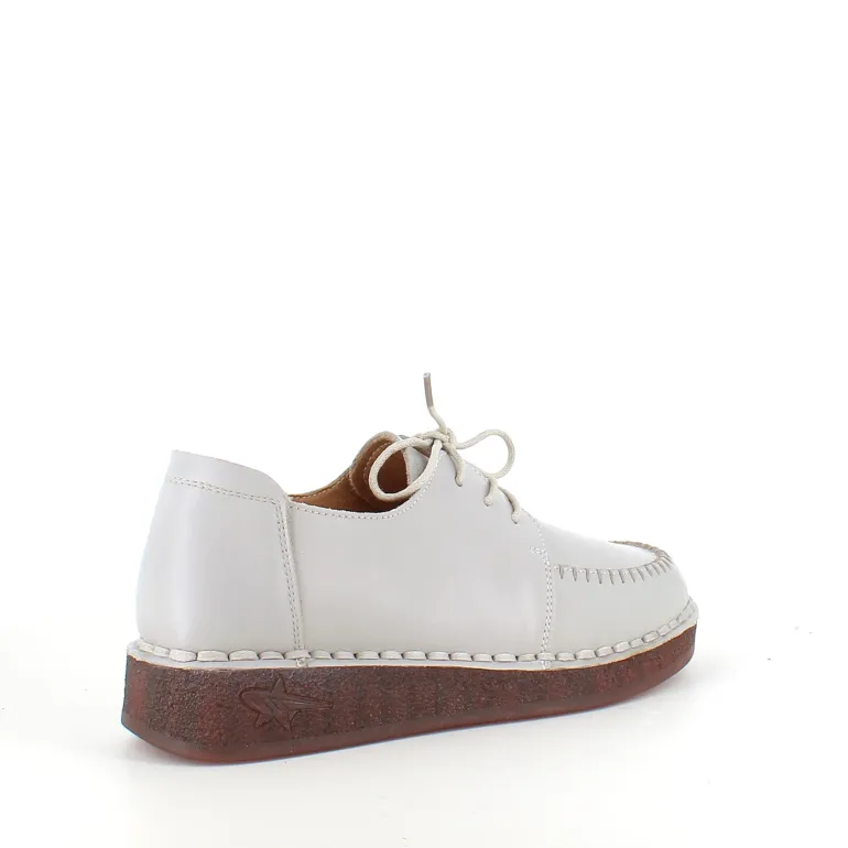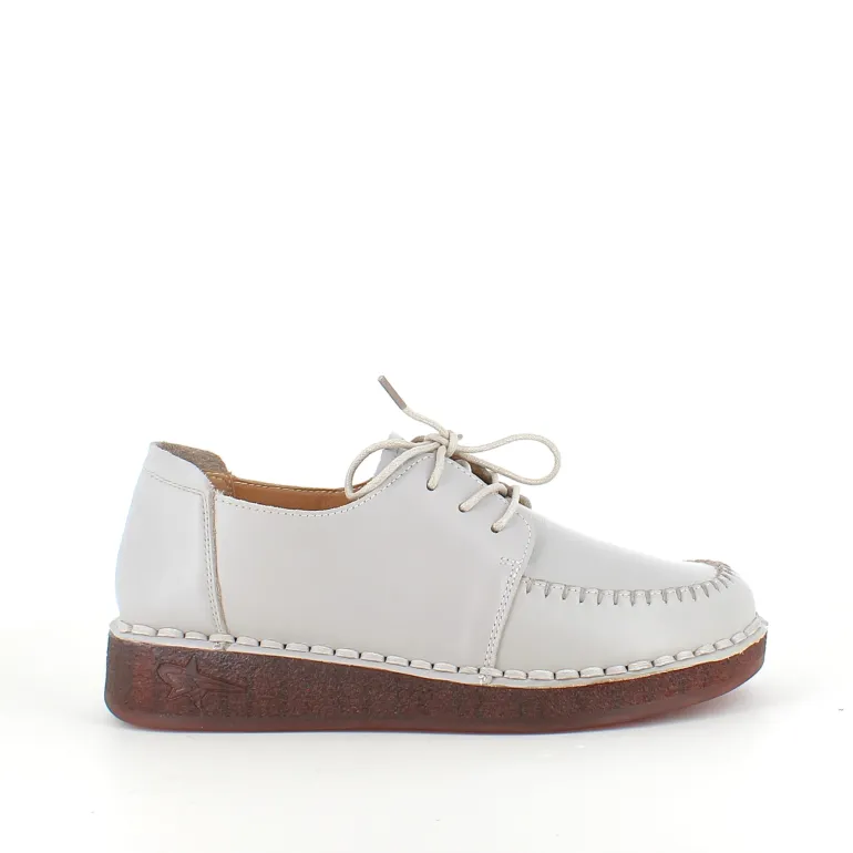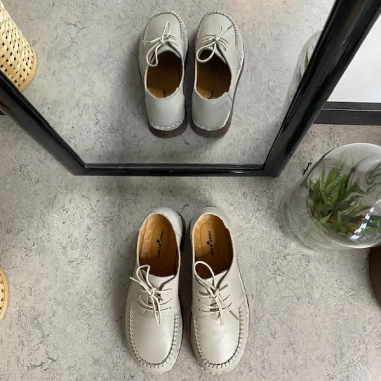 Snøresko i lys beige skind med flotte detaljer i skindets sammensyning på overdelen.