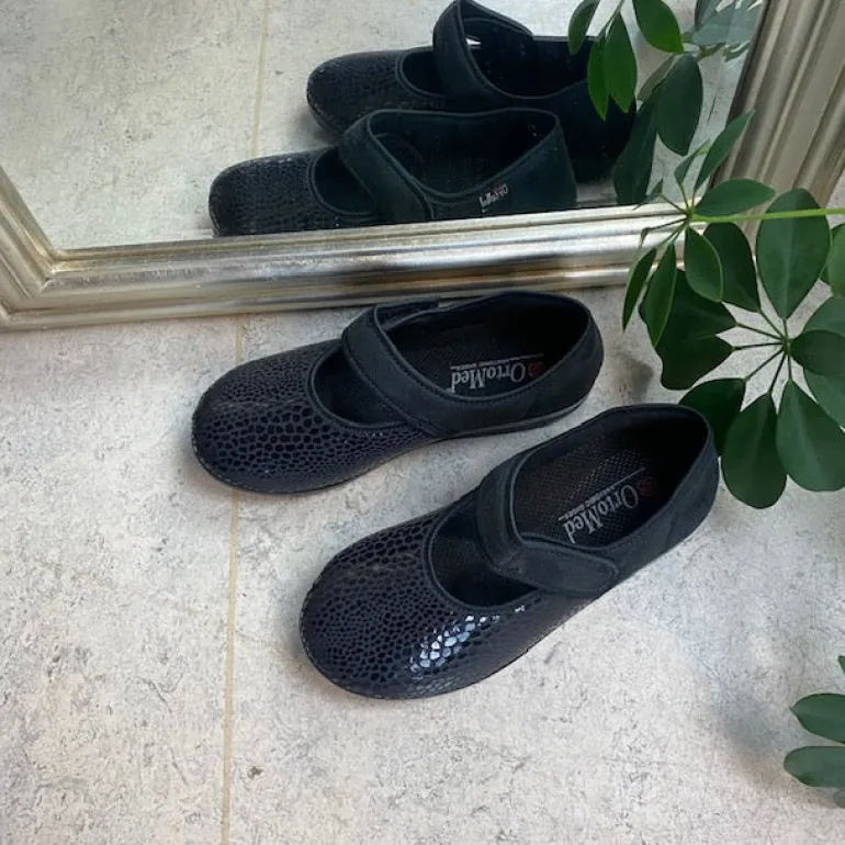 Bred ortopædisk sko i sort med velcro omkring ankel. Forfoden har glat elastisk stof som giver forfoden ekstra plads.