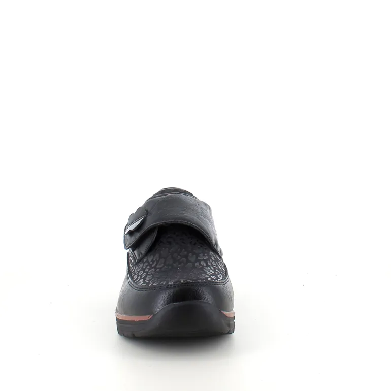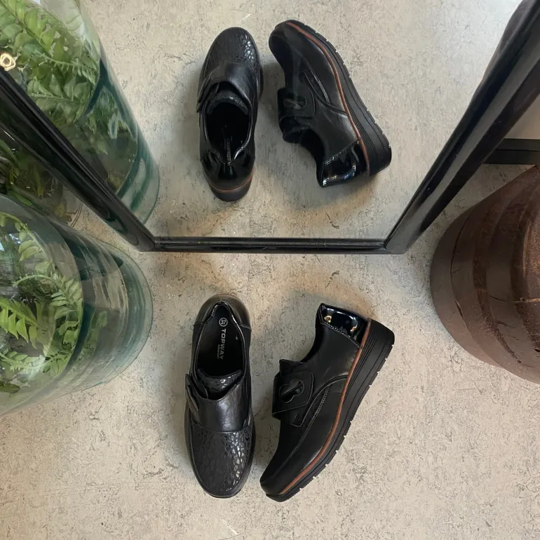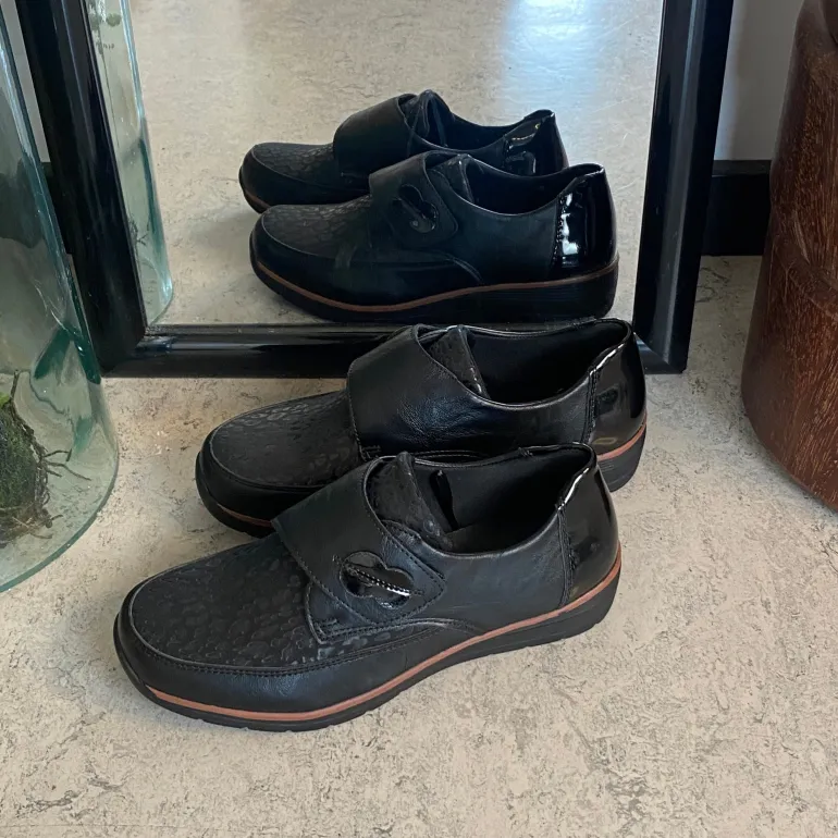 Skoen har velcrolukning som gør den nem at tage af og på.