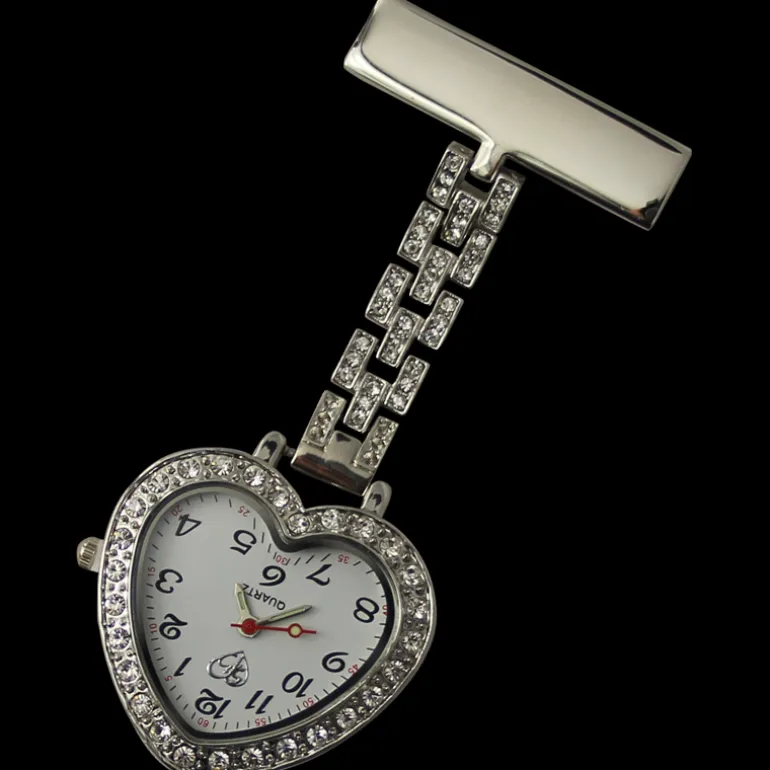 Feminint sygeplejeur med hjerteformet urskive, pyntet med krystaller hele vejen rundt. Sygeplejeuret er 8 cm langt og 3,5 cm bredt.