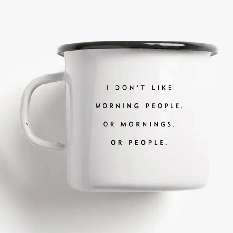 Denne hvide emaljekop er dekoreret med en ærlig og humoristisk tekst: “I don’t like morning people. Or mornings. Or people.” – en perfekt ledsager til dig, der ikke er morgenmenneske, og som elsker at starte dagen med et smil (eller en stille kop kaffe).