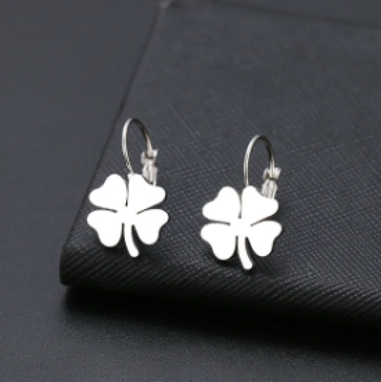 Øreringe med kløver i sølvtone. De er lavet i rustfri stål.