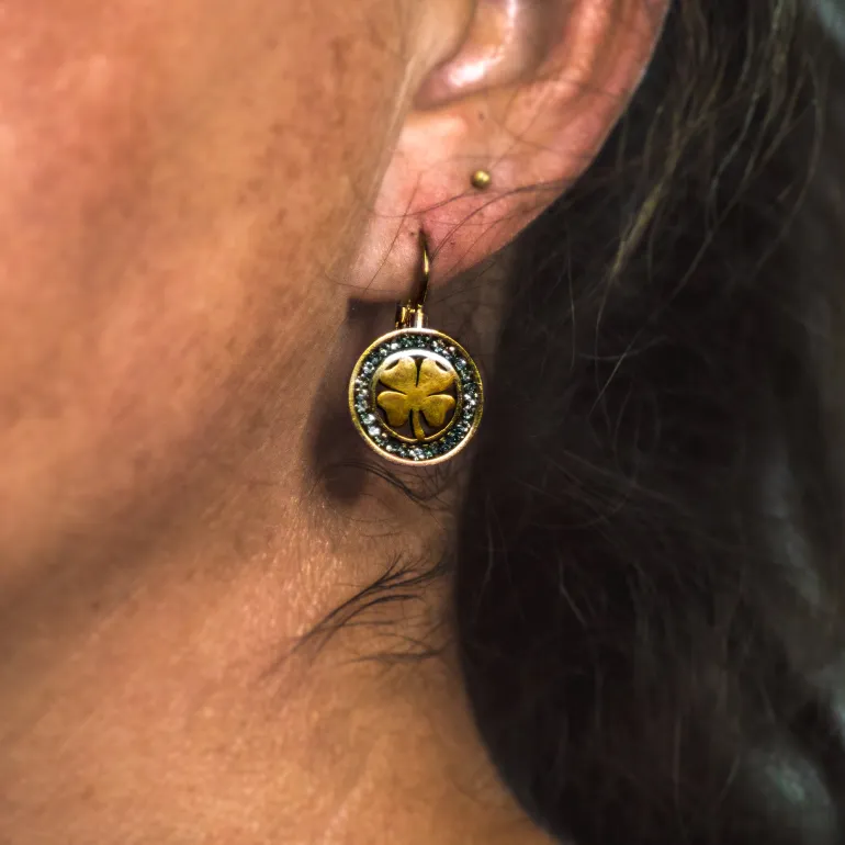 Øreringe med kløver i guldtone. Søde små sten i en cirkel rundt om firkløveret.