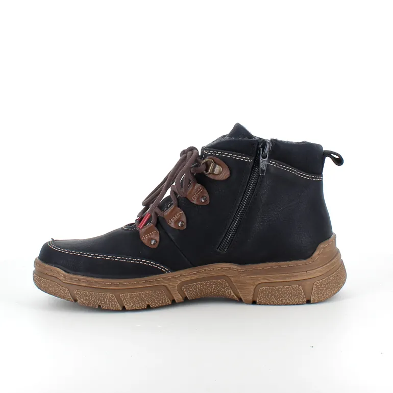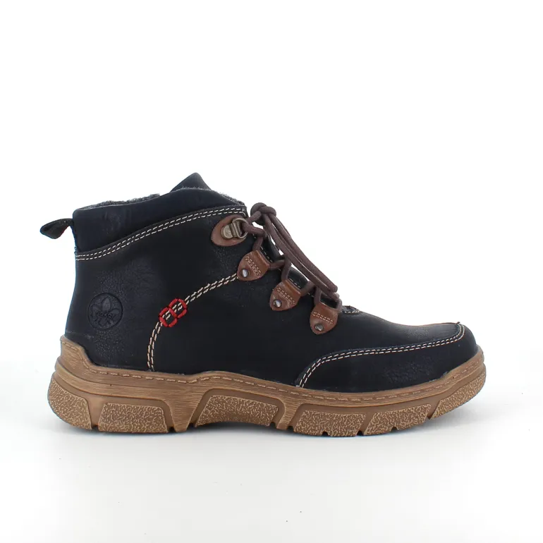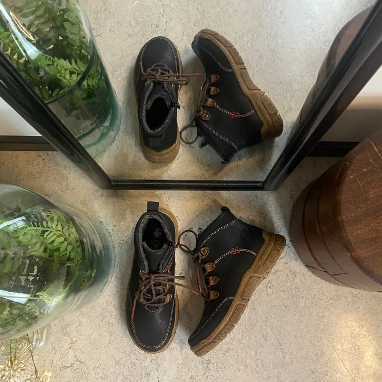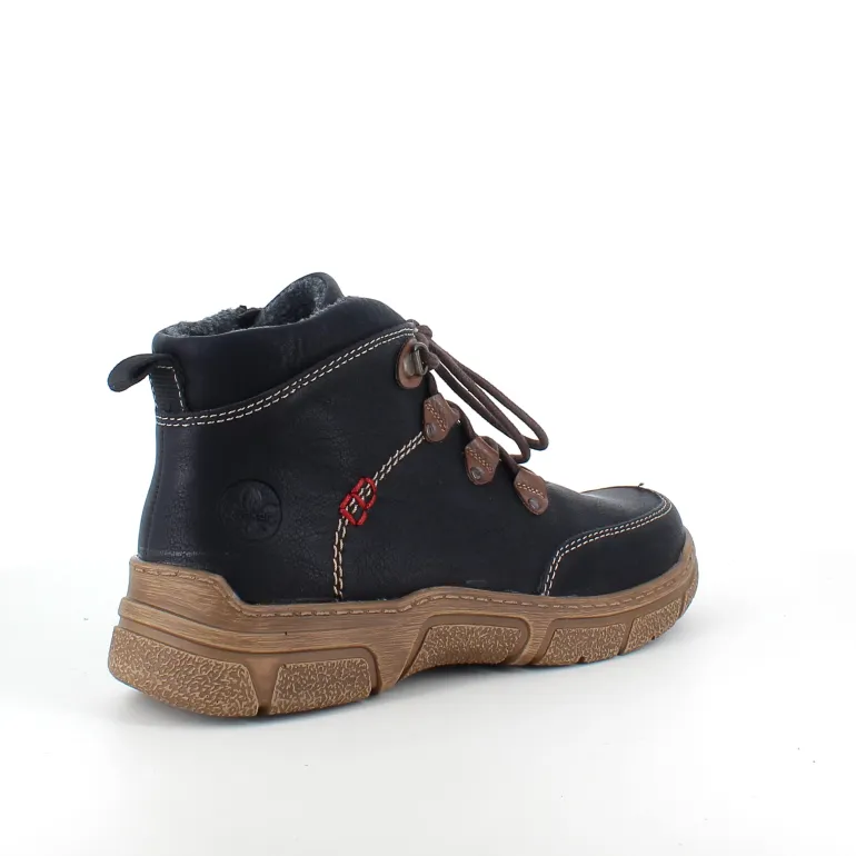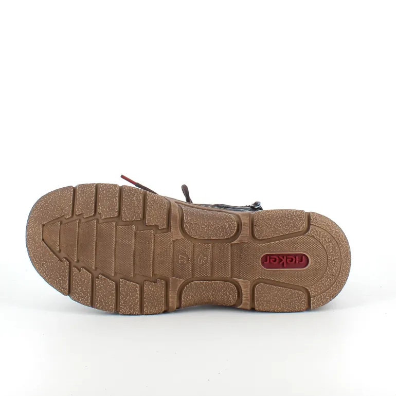 Den sorte overdel med lys syning og et diskret RIEKER-logo giver skoen et moderne og stilfuldt udtryk, mens snørebåndene og den praktiske lynlås på siden sikrer nem påtagning og individuel tilpasning.