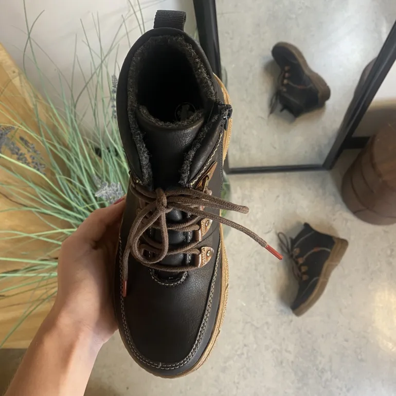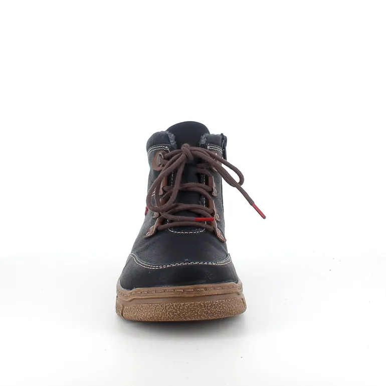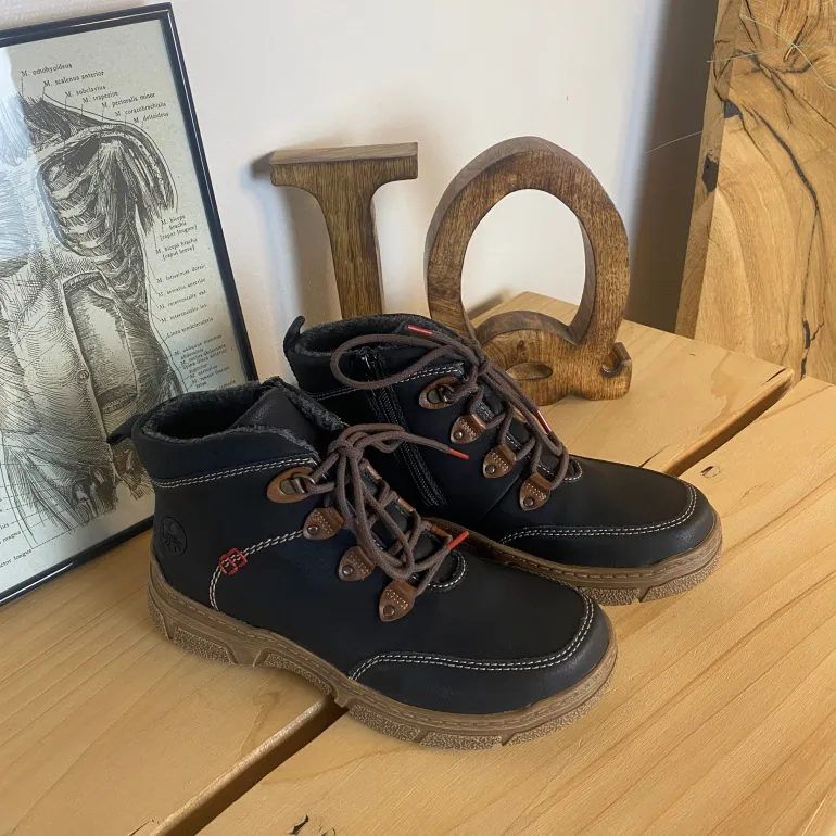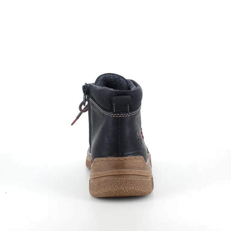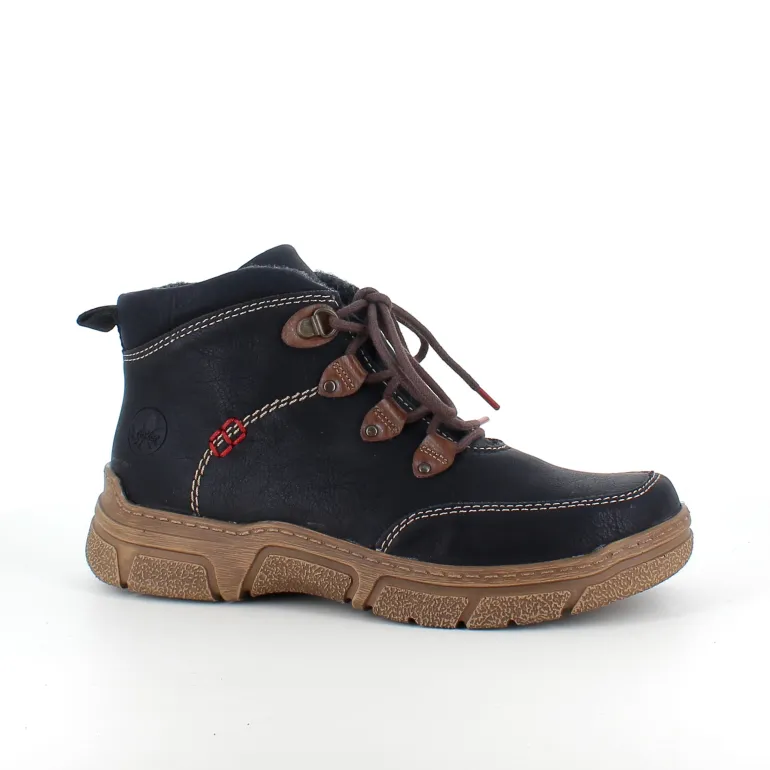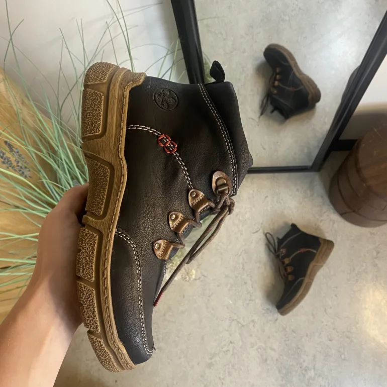 Den sorte overdel med lys syning og et diskret RIEKER-logo giver skoen et moderne og stilfuldt udtryk, mens snørebåndene og den praktiske lynlås på siden sikrer nem påtagning og individuel tilpasning.