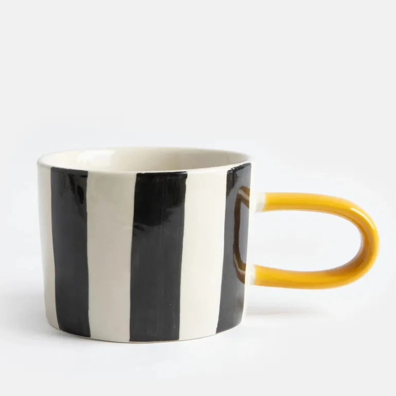 Dette krus kombinerer klassiske striber med et farverigt twist. Den cremefarvede overflade er dekoreret med brede, håndmalede sorte striber, der giver et stilrent og grafisk udtryk. Som kontrast har kruset en blank gul hank, der tilfører energi og personlighed til designet.