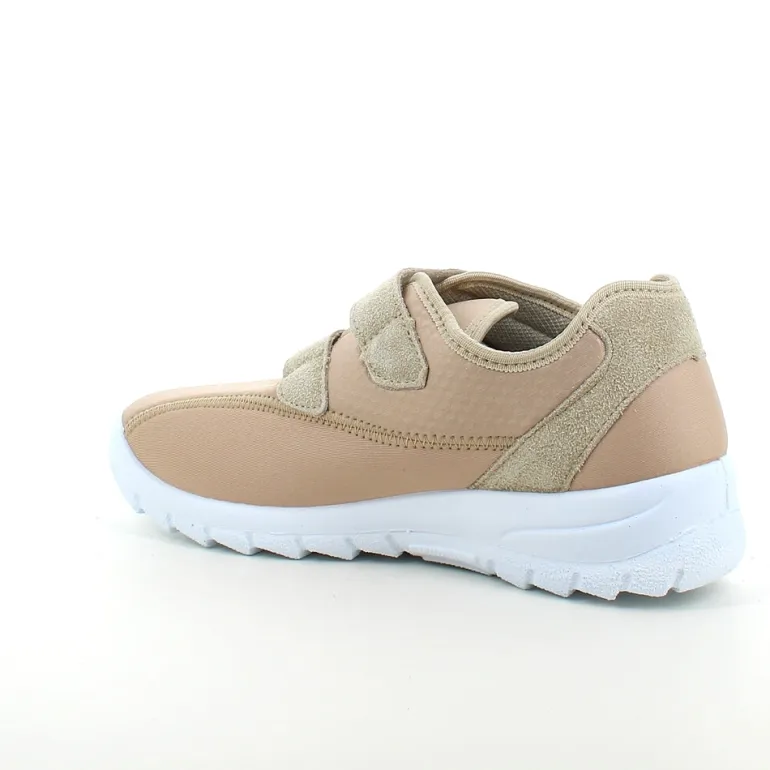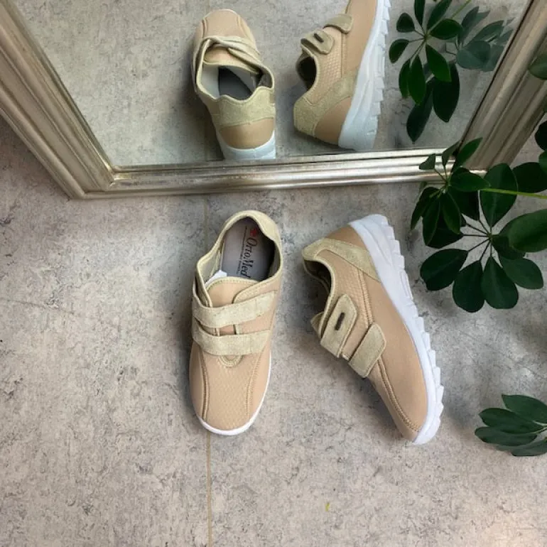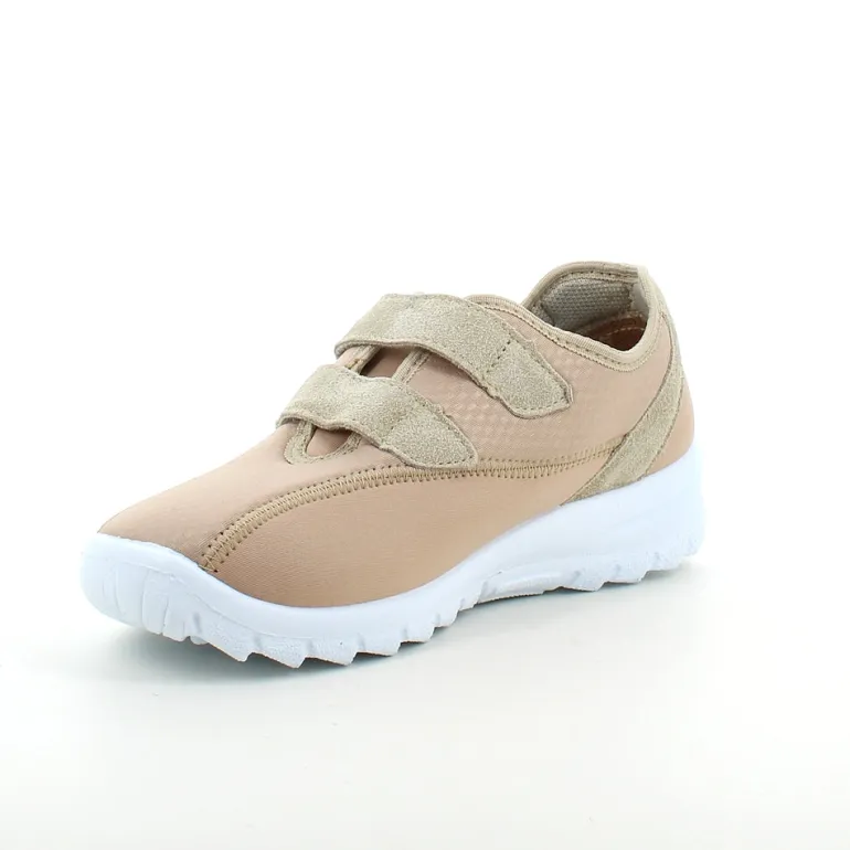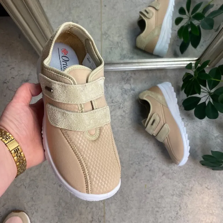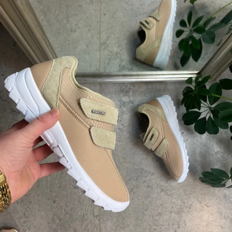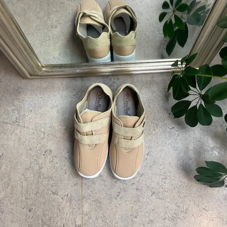 Sko i lys beige med skind detaljer og en meget bred pasform.