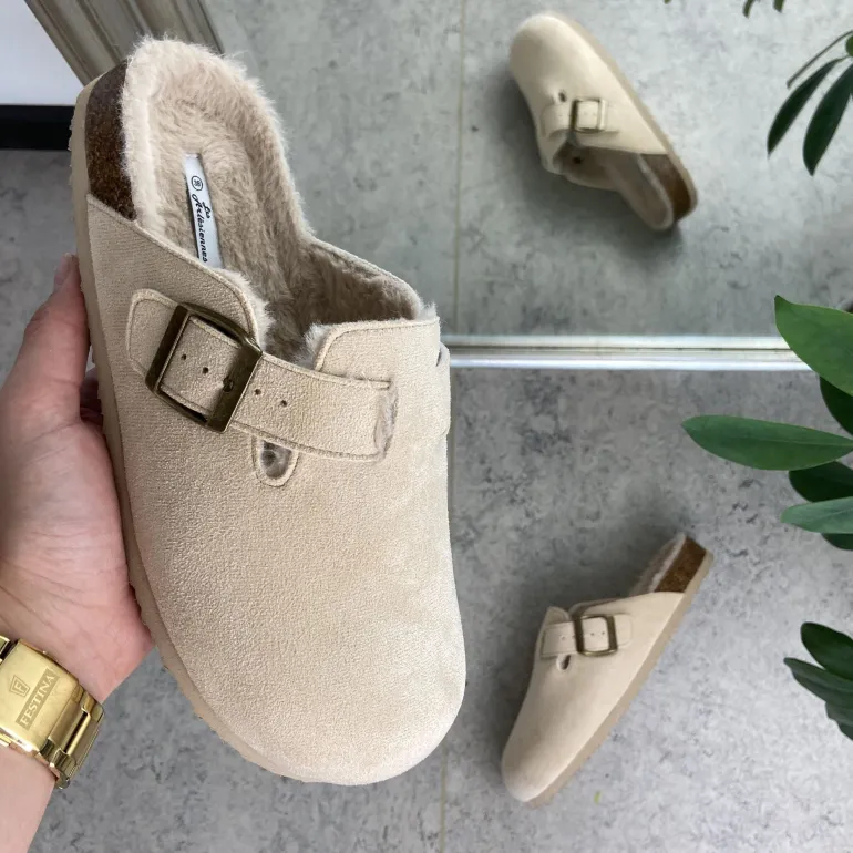 Lys Slip-on hjemmesko med en overdel i tekstil. Hjemmeskoen har en justerbar rem over forfoden Skoen er foret med blødt fleece for Mellemsålen er en korksål og ydersålen er en blød, rillet sål Sutskoen kommer i størrelserne 36-41