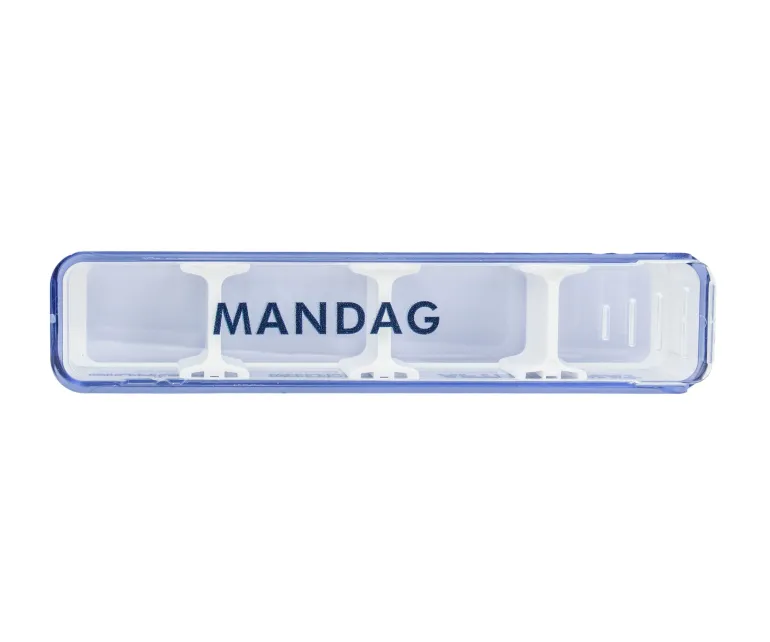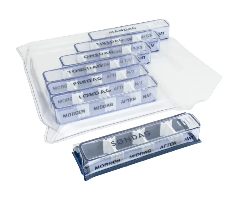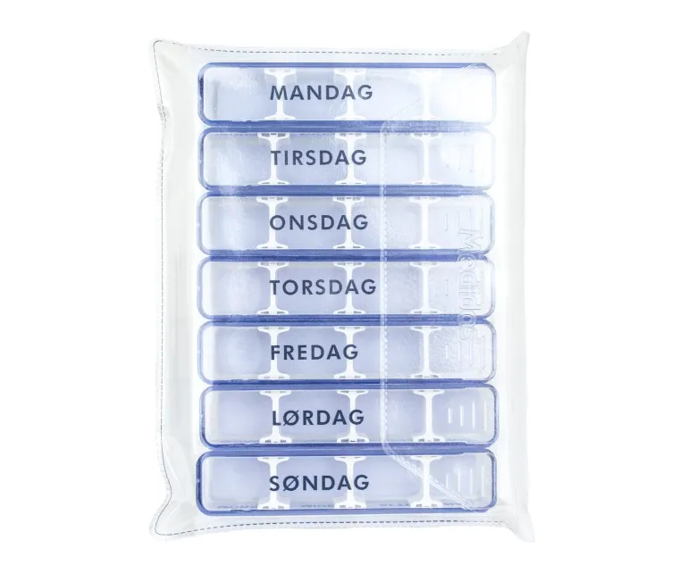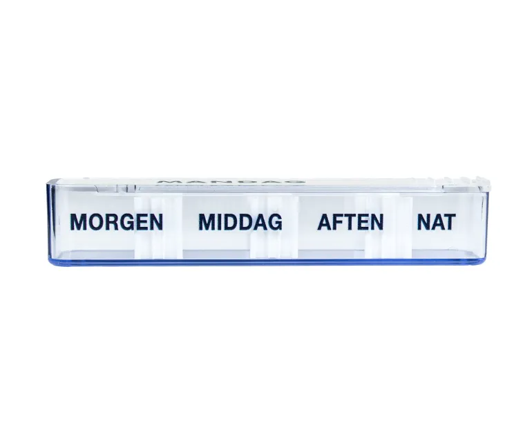 Hver doseringsæske har flytbare skillevægge, ugedage og med morgen, middag, aften og nat påskrevet på hver æske.