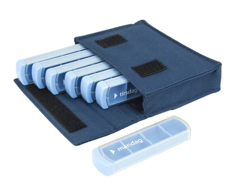 Få styr på din medicin med dette smarte Medinizer doseringssystem, der er designet til en hel uge. I den kompakte, diskrete blå nylontaske får du 7 separate doseringsæsker – én for hver ugedag. Hver æske er tydeligt inddelt i fire rum mærket: morgen, middag, aften og nat, så du nemt kan holde styr på dagens doseringer.