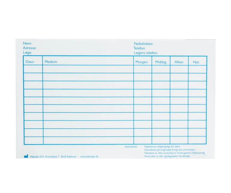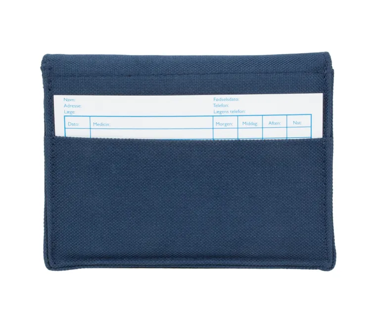 Tasken, der måler 16 x 10,5 x 3,5 cm, lukkes med praktisk velcro og har et medicinkort indsat bagpå, så du altid kan have dine medicinoplysninger lige ved hånden. Æskerne måler 9,5 x 2 cm, og hvert rum har plads til 2 x 2 cm, perfekt til både piller og små tabletter.