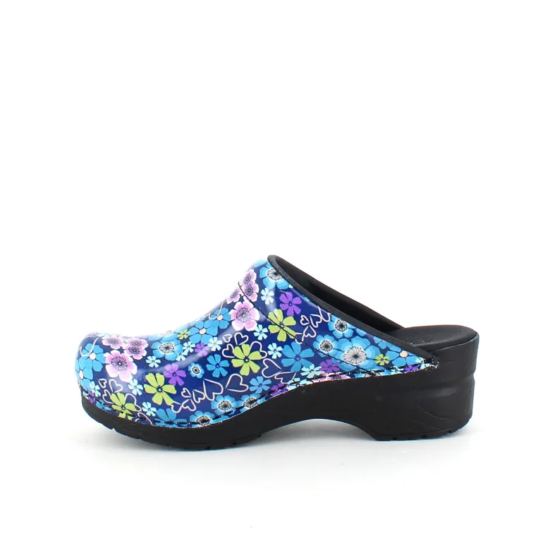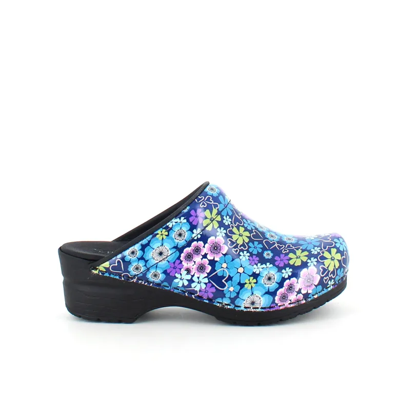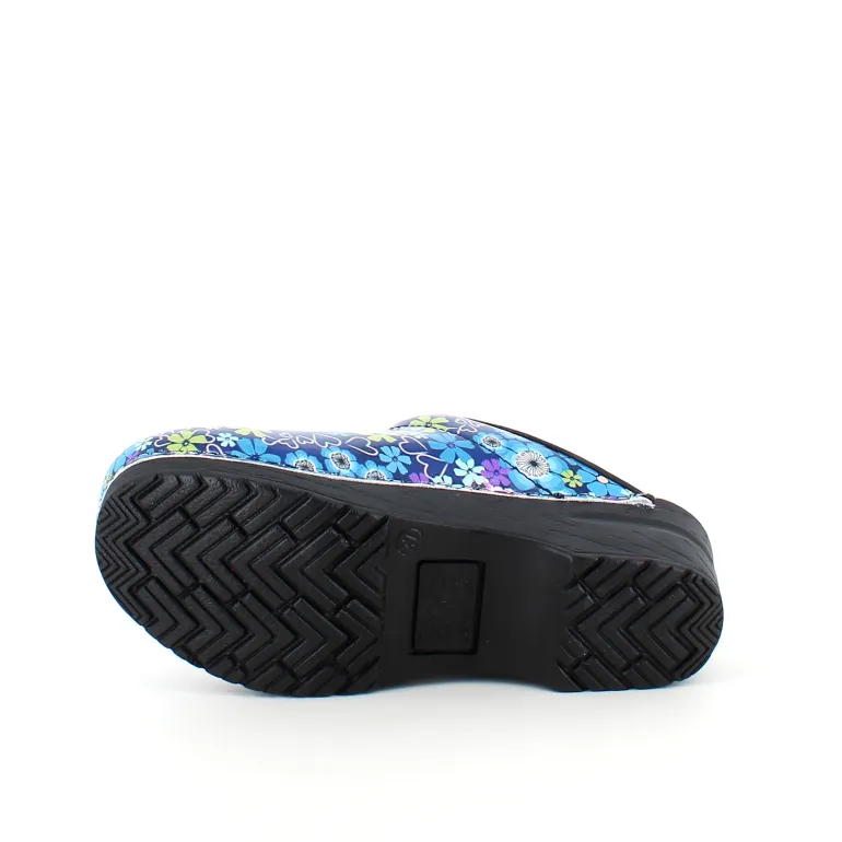 Elegant og komfortabel tøffeltræsko i et flot blå og lilla blomstret træsko i printet lak læder.