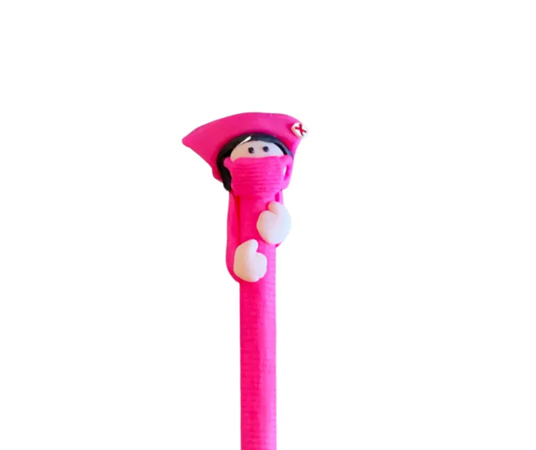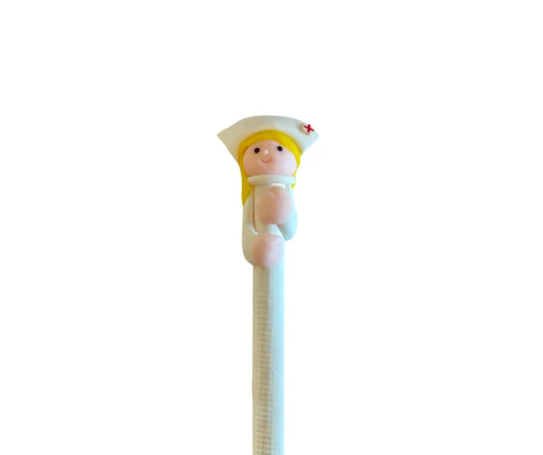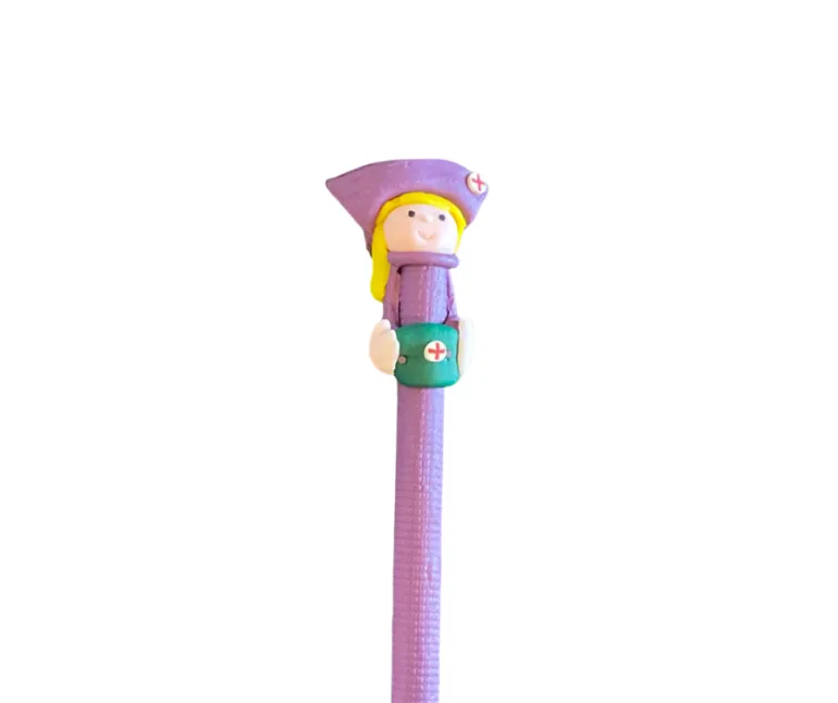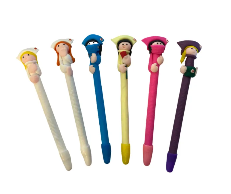 En sygeplejerske med hvid kappe og brunt hår , en pink med pink kappe, en i lilla, en i blå, en med hvid kappe og gult hår og en i gul.