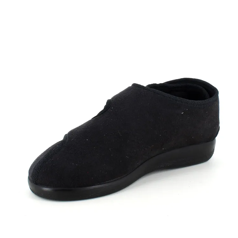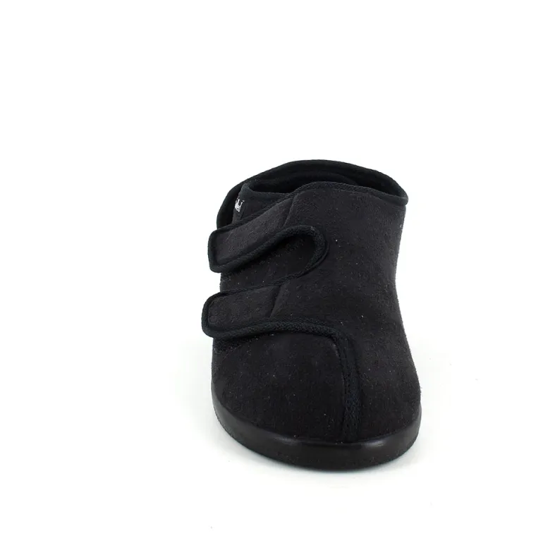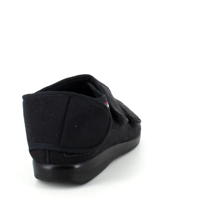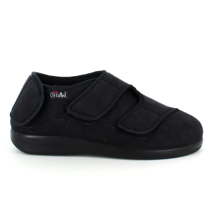 Bred ortopædisk sko i sort med velcro i forfod. Skoen har også velcro omkring ankel og omkring hælen.