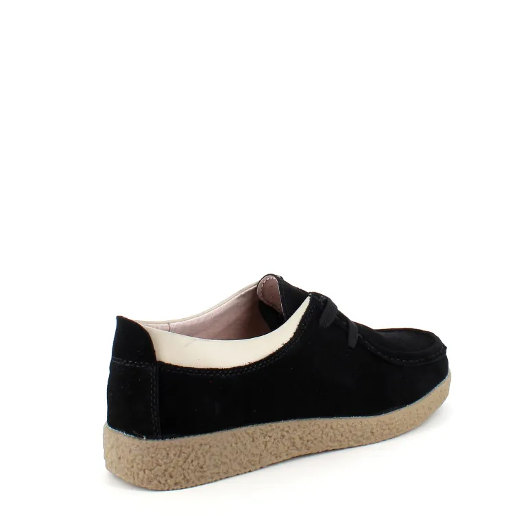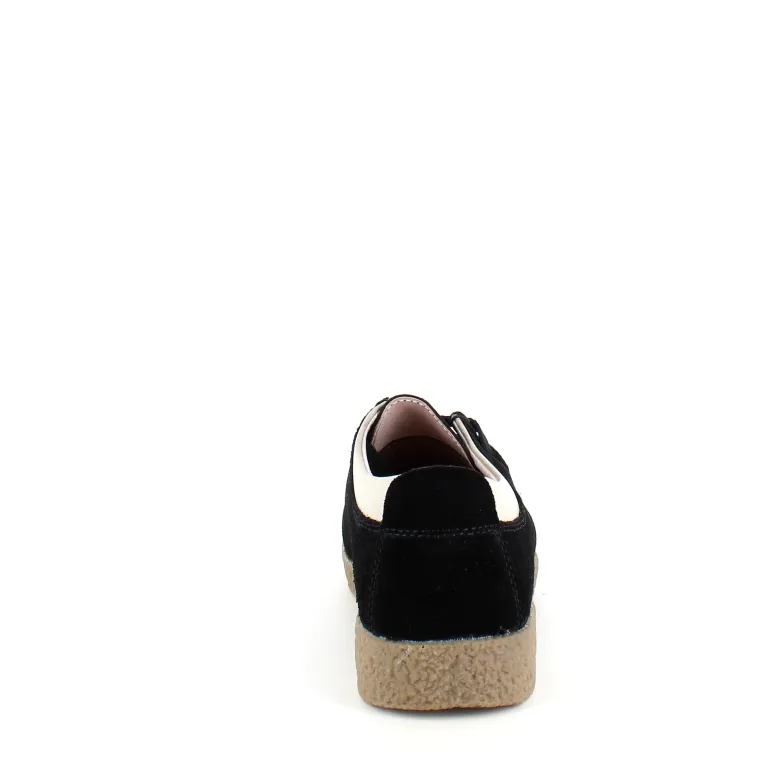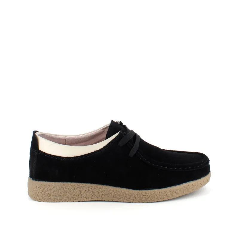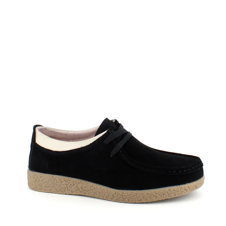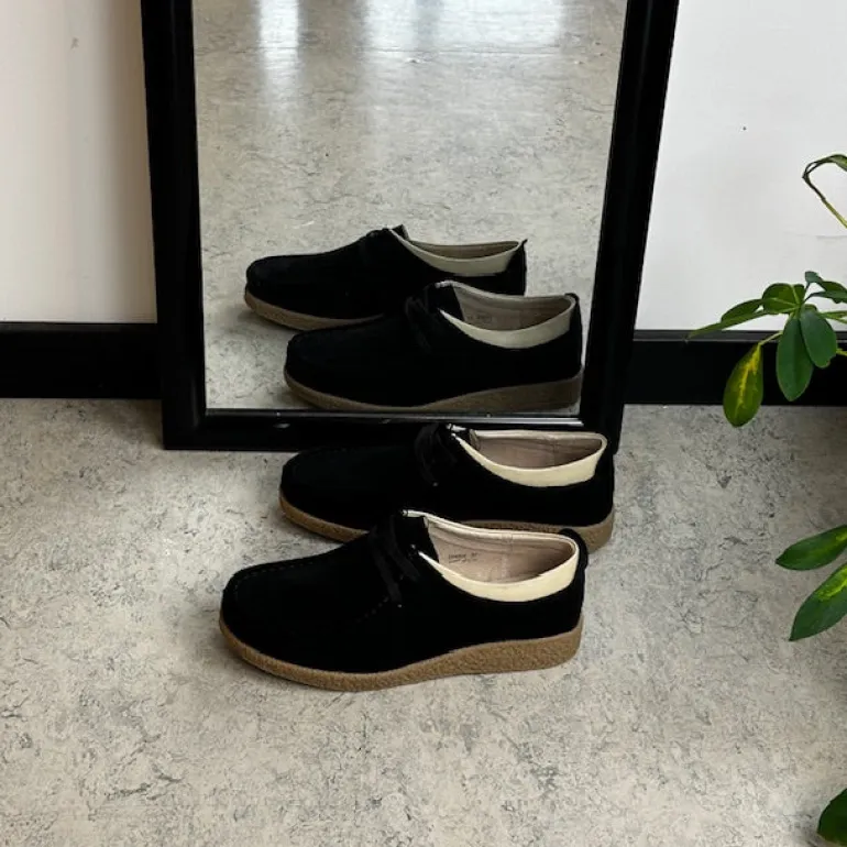 Sort ruskindsko med gummisål har en elegant design med en beige læderkant ved åbningen. Skoen har snørelukning og en tydelig syning i overdelen, som giver et stilfuldt udseende. Den indvendige skum sål er beklædt med læder for komfort, og modellen er almindelig/smal med en bredde på 7.5 cm i størrelse 37. Ydersålen er lavet af rågummi, hvilket giver god stødabsorbering og fleksibilitet. Skoen fås i størrelserne 36-42 og i mange forskellige farver.