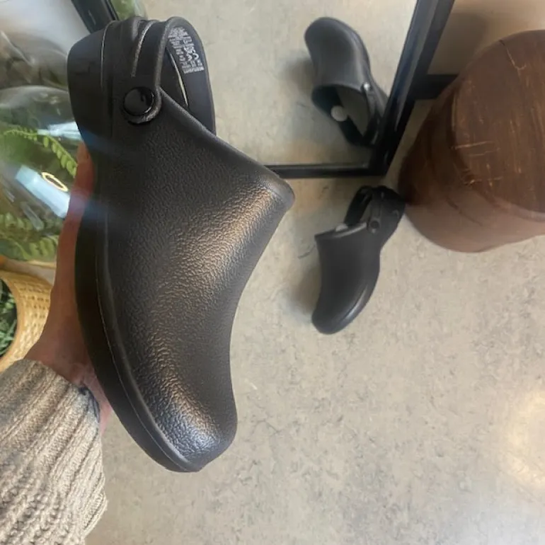 Designet er 100 % metalfrit og lavet med fokus på hygiejnisk rengøring og vedligeholdelse. Skoen kan vaskes ved 30°C og tåler både kemisk og UV-sterilisering, hvilket effektivt reducerer bakterier og mikroorganismer.