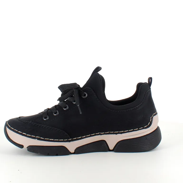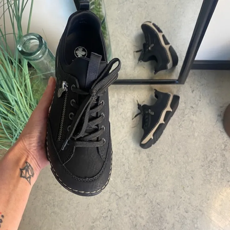 Disse flotte Rieker sneakers i sort til damer – enkel i design med smarte detaljer som pyntelynlås og elastisk åbning, der gør skoen nem at tage af og på. Snørebåndet kan justeres for optimal pasform.