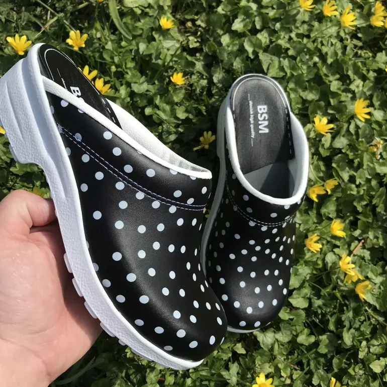 Sorte polkaprikkede træsko i dansk kvalitet.
