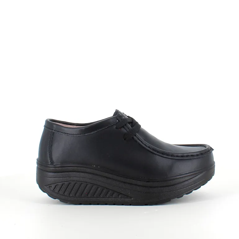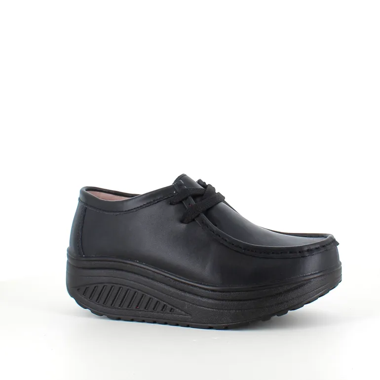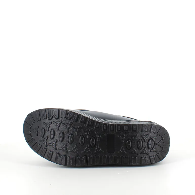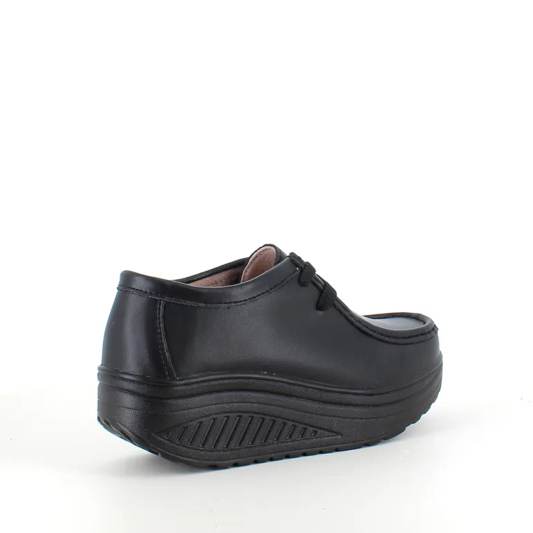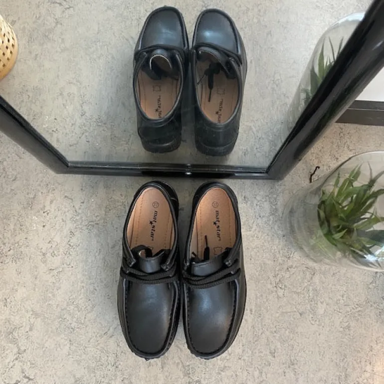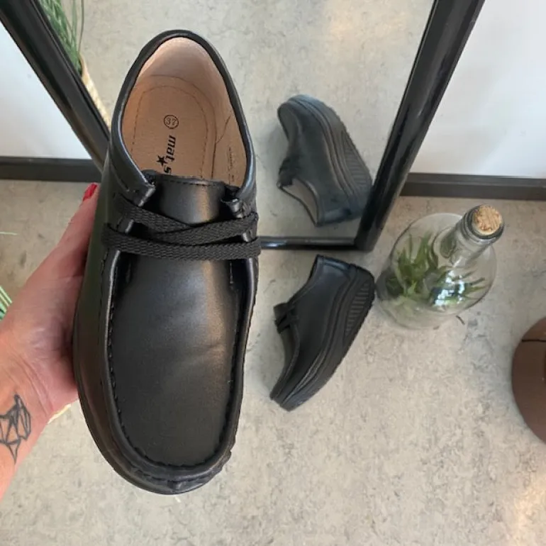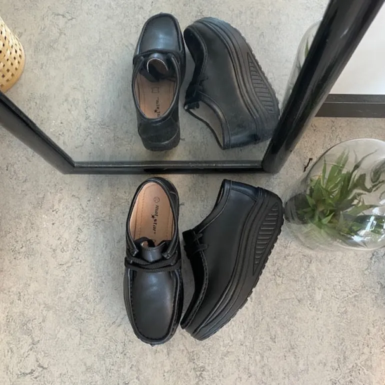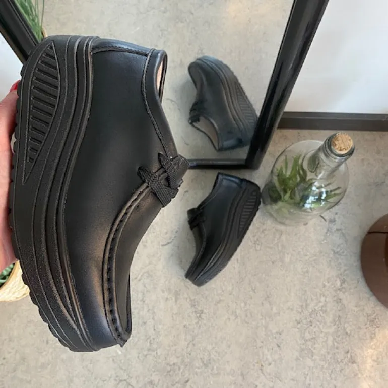 Sort skindsko med gængesål og svangstøtte kombinerer stil og komfort.
