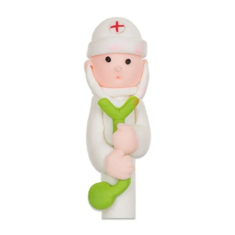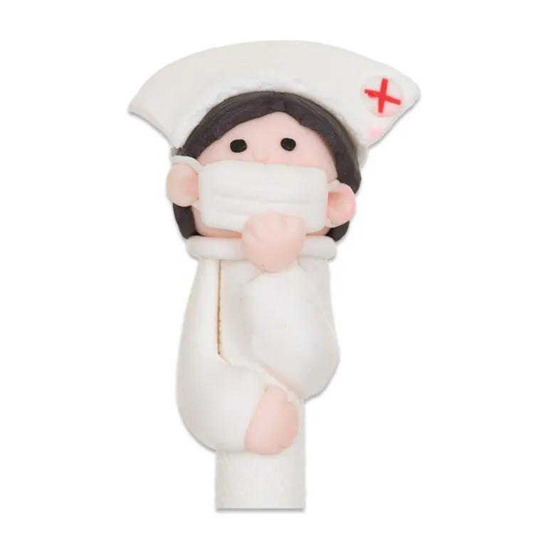 En sygeplejerske med hvid kappe, en pink med pink kappe, en med grøn stetoskop, sygeplejerske med gul stetoskop og en med blå stetoskop.