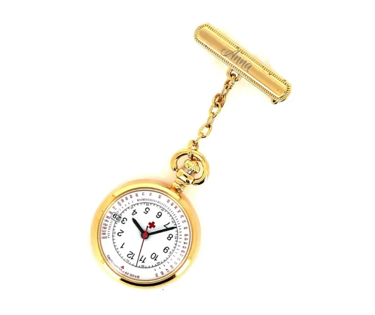 Flot sygeplejeur i guldtone med gravering. Dette sygeplejeur har dato felt i urskiven hvilket gør det nemt at se datoen, når der skrives journal.