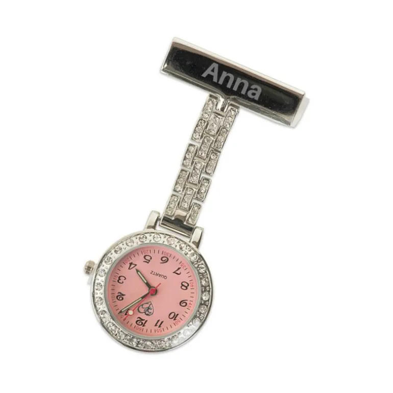 Sødt sygeplejeur med krystaller og gravering. Sygeplejebutikken anbefaler navn foran på vedhæftningsdelen. Vi anbefaler max. 14 bogstaver for, at det bliver pænt.