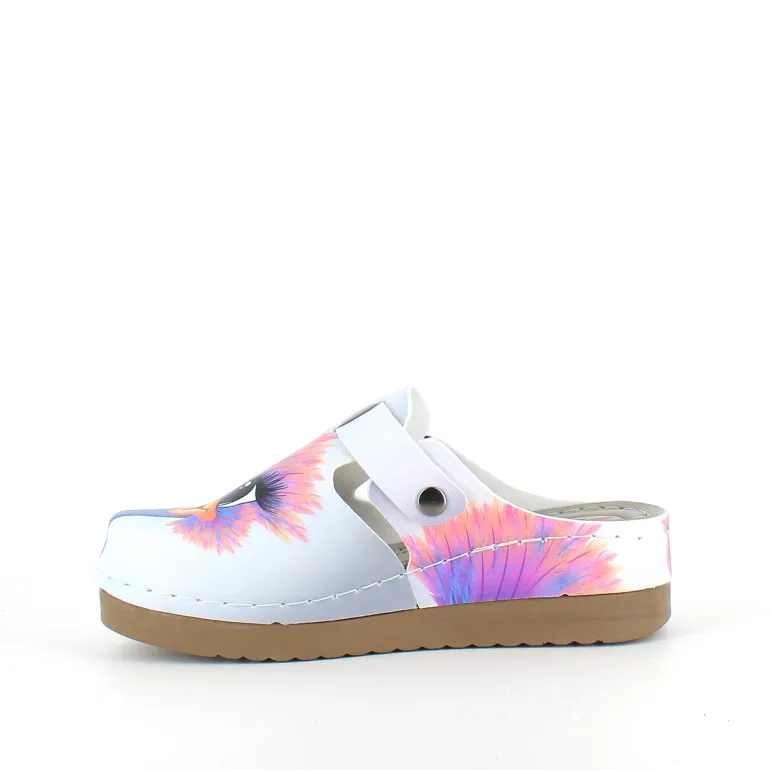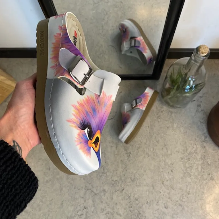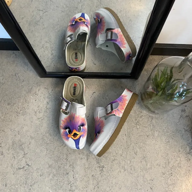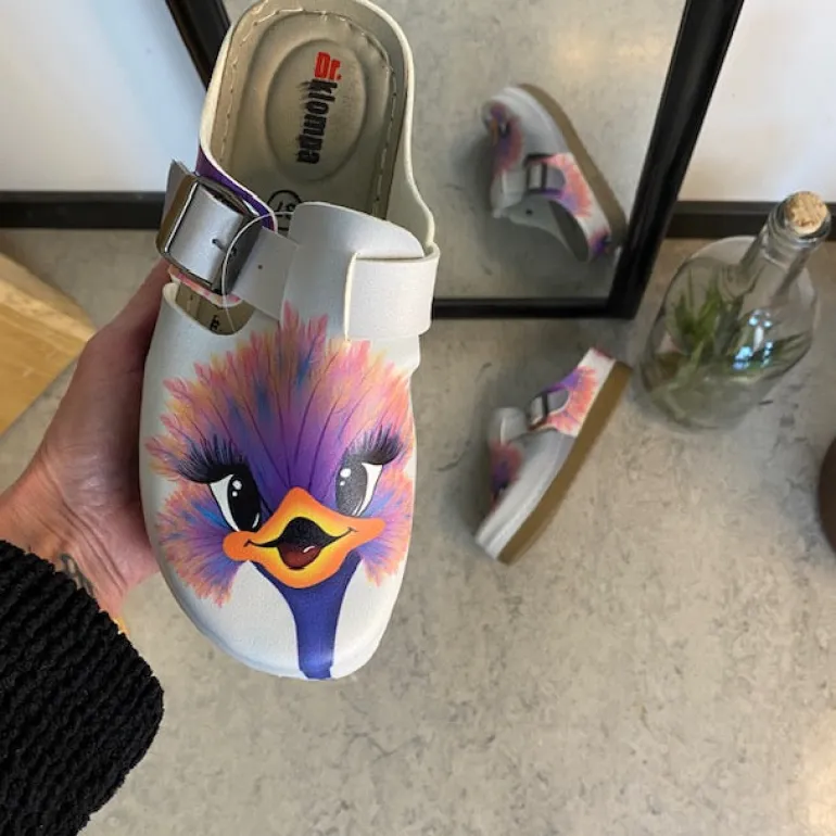 Træskoene har et print af en glad struds på overdelen.